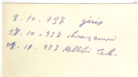 "8.10.937 giriş 27.10.937 ihraç kararı 11.11.937 mektebi terk"