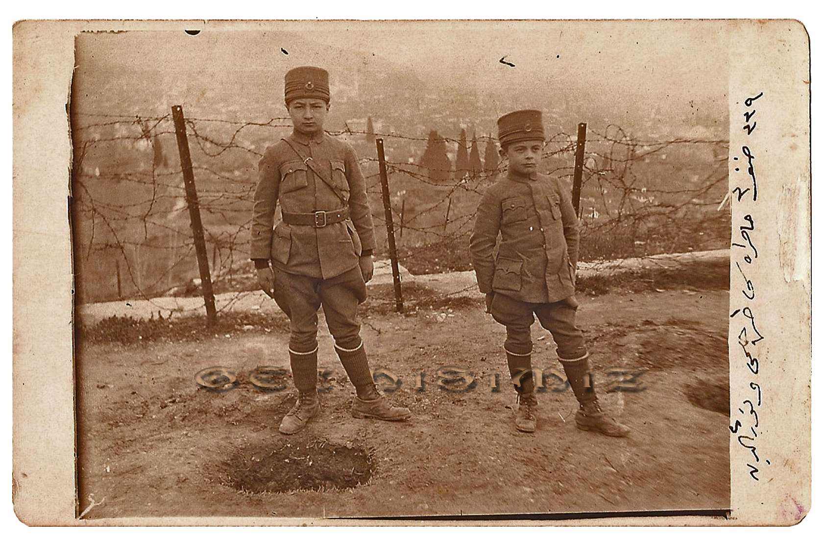 Fotoğrafın ön yüzündeki not: "2. Sınıf hatırası Hasan Hilmi (Amcam) ve Nureddin 1339".