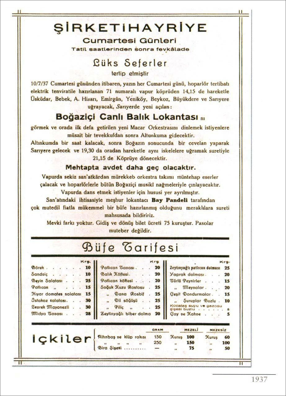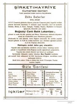 Şirketi Hayriye'nin (Denizcilik İşletmeleri) İstanbul Boğazında 1930'ların sonunda başlattığı yemekli vapur seferlerinin el ilânı. 1937